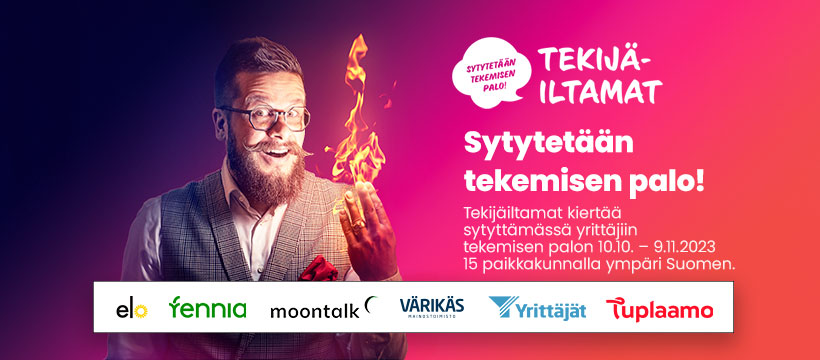 Myynti tuo rahat. Markkinointi helpottaa myyntiä. Molemmissa tekeminen ratkaisee. Jos tuli ei pala, se täytyy sytyttää. Tekijäiltamissa roihu leimahtaa 15 paikkakunnalla ympäri Suomen. Yrittäjä, tule mukaan Hämeenlinnan iltamiin!