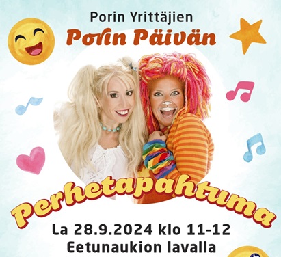 Perhetapahtuma 28.9.2024 klo 11:00 – 12:00 Porin Yrittäjät { "name":"Perhetapahtuma", "description":"", "startDate":"2024-09-28", "startTime":"11:00", "endDate":"2024-09-28", "endTime":"12:00", "location":"", "label":"Lisää kalenteriin", "options":[ "Apple", "Google", "iCal", "Microsoft365", "MicrosoftTeams", "Outlook.com", "Yahoo" ], "inline":true, "listStyle":"modal", "trigger":"click", "timeZone":"Europe/Helsinki", "iCalFileName":"Yrittajat.fi - Perhetapahtuma" } Maksuton Lisätiedot ja tietosuoja-asiat Porin Päivän perinteinen koko perheen tapahtuma. Jaa Kopioitu leikepöydälle