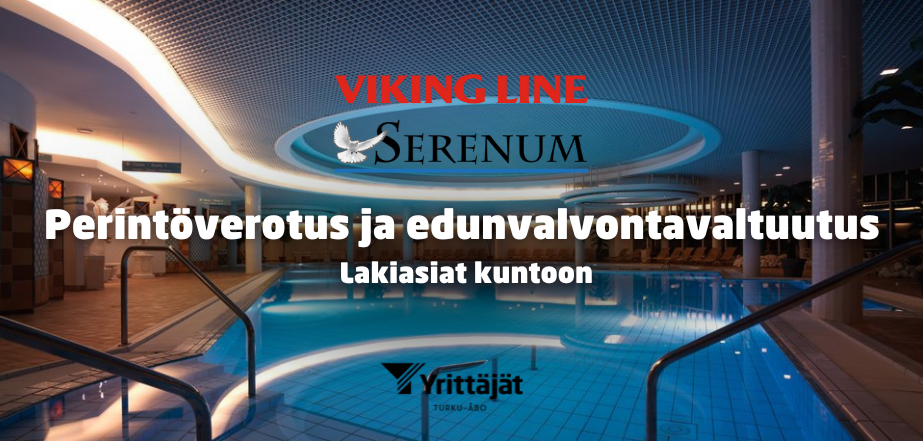 Maksuttoman koulutuksen, tarjoilut ja rentouttavan kylpylähetken mahdollistaa Viking Line ja Serenum. Varaudu tulevaan perintöverotus ja edunvalvontavaltuutus -aiheella. Tilaisuus sopii kaikenikäisille yrittäjille – jos tulevaisuuden suunnittelu on mielessä, tämä tapahtuma on juuri sinua varten