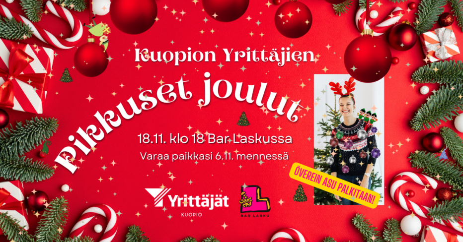 Kuopion Yrittäjien Pikkuset Joulut järjestetään 18.11. klo 18-23 Bar Laskussa. Luvassa on hyvää ruokaa, Dj ja karaoke, lahjojen jako sekä mitä mainiointa seuraa. Pikkujoulujen teema on tänä vuonna Ugly Christmas Sweater. Överein asu palkitaan!
