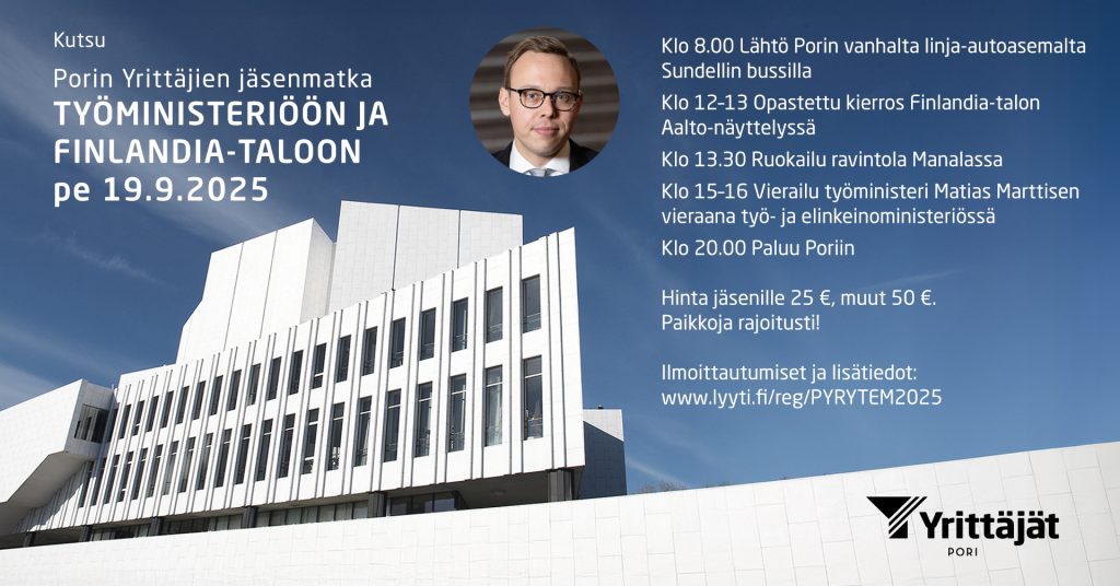 Tervetuloa mukaan Porin Yrittäjien jäsenmatkalle Työ- ja elinkeinoministeriöön ja Finlandia-taloon Helsinkiin perjantaina 19.9.2025.