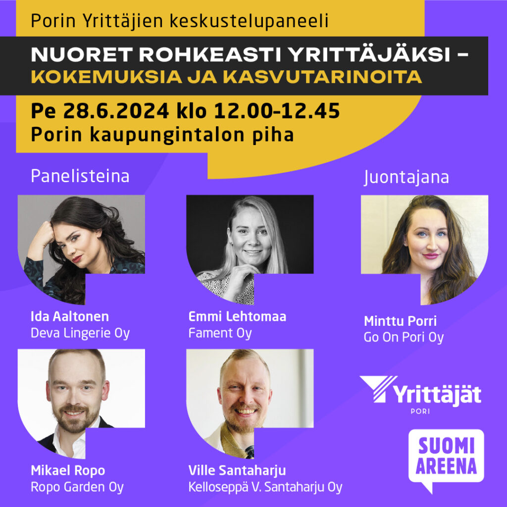 Porin Yrittäjien keskustelupaneeli Suomi-Areenassa perjantaina 28.6. klo. 12.00- 12.45 Kaupungintalon pihalla, aiheena Nuoret rohkeasti yrittäjäksi – kokemuksia ja kasvutarinoita.
