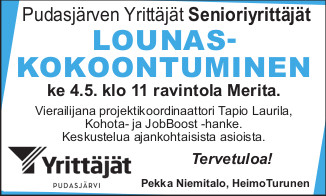Pudasjärven yrittäjien senioriyrittäjät järjestää lounaskokoontumisen keskiviikkona 4.5.2022 klo 11 ravintola Meritassa.