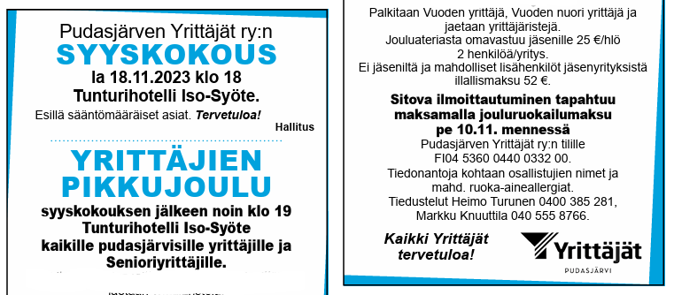 Pudasjärven Yrittäjät ry:n Syyskokous la 18.11.2023 klo 18 Tunturihotelli Iso-Syöte.