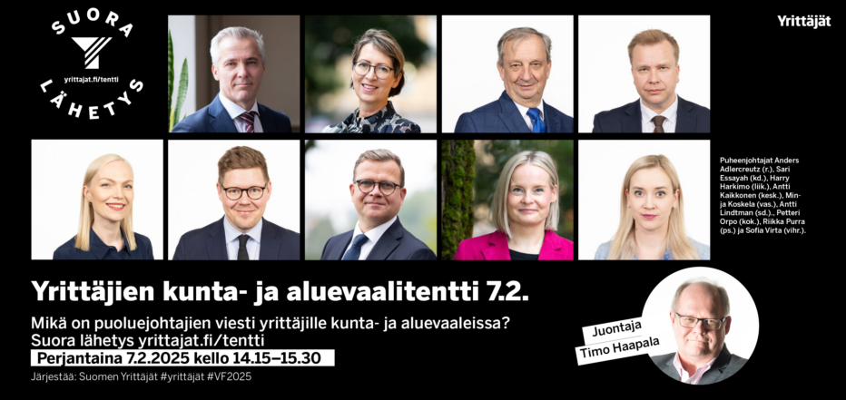 Yrittäjien kunta- ja aluevaalitentissä kohtaavat eduskuntapuolueiden puheenjohtajat Anders Adlercreutz (r.), Sari Essayah (kd.), Harry Harkimo (liik.), Antti Kaikkonen (kesk.), Minja Koskela (vas.), Antti Lindtman (sd.)., Petteri Orpo (kok.), Riikka Purra (ps.) ja Sofia Virta (vihr.).