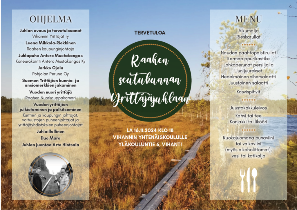 Marraskuussa juhlitaan yrittäjyyttä ja Raahen seutukunnan vuoden yrittäjiä! Tänä vuonna juhlakansaa odotetaan sankoin joukoin Vihantiin.