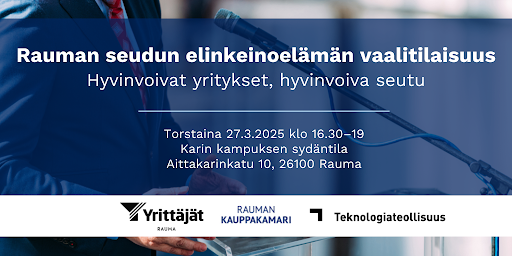 Tervetuloa mukaan Rauman seudun elinkeinoelämän vaalitilaisuuteen, jonka toteuttavat yhteistyössä Rauman kauppakamari, Rauman Yrittäjät ry ja Teknologiateollisuus ry. Tilaisuus tarjoaa erinomaisen mahdollisuuden kuulla alueen elinkeinoelämän näkemyksiä ja ajankohtaisia kuulumisia sekä tavata ehdokkaita ja yritysten edustajia.
