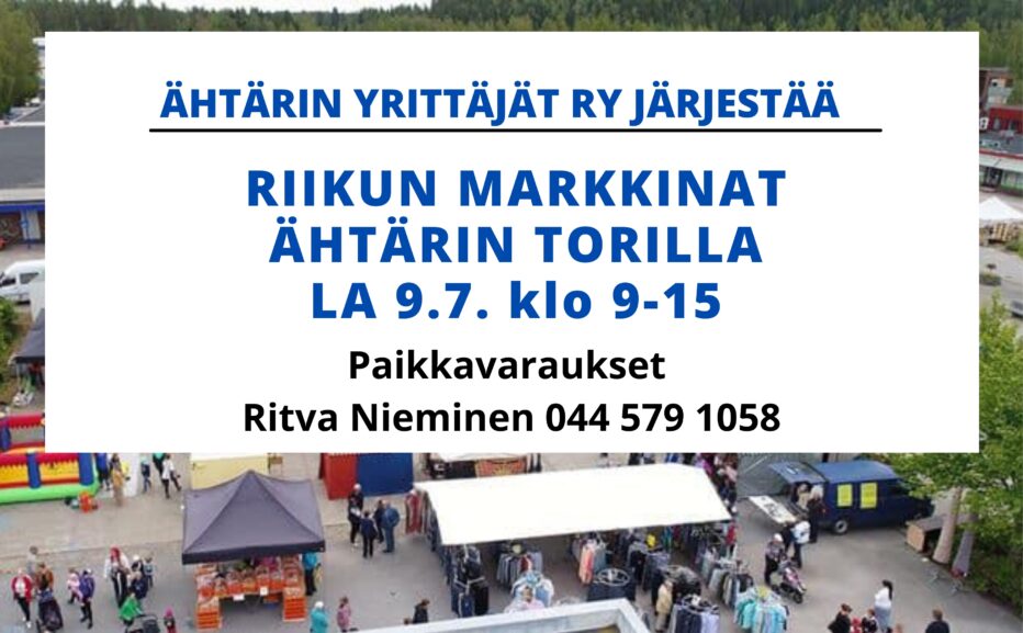 Riikun Markkinat Markkinat, näyttelyt ja messut Riikun Markkinat 9.7.2022 klo 09:00 – 15:00 Ähtäri Etelä-Pohjanmaan Yrittäjät Ähtärin Yrittäjät Tavataan taas kahden vuoden tauon jälkeen Riikun Markkinoilla Ähtärin torilla 9.7.2022! { "name":"Riikun Markkinat", "description":"", "startDate":"2022-07-09", "startTime":"09:00", "endDate":"2022-07-09", "endTime":"15:00", "location":"Ostolantie 8 63700 htri", "label":"Lisää kalenteriin", "options":[ "Apple", "Google", "iCal", "Microsoft365", "MicrosoftTeams", "Outlook.com", "Yahoo" ], "inline":true, "listStyle":"modal", "trigger":"click", "timeZone":"Europe/Helsinki", "iCalFileName":"Yrittajat.fi - Riikun Markkinat" } Maksuton Ostolantie 8, 63700 Ähtäri , Ähtäri Jaa Kopioitu leikepöydälle