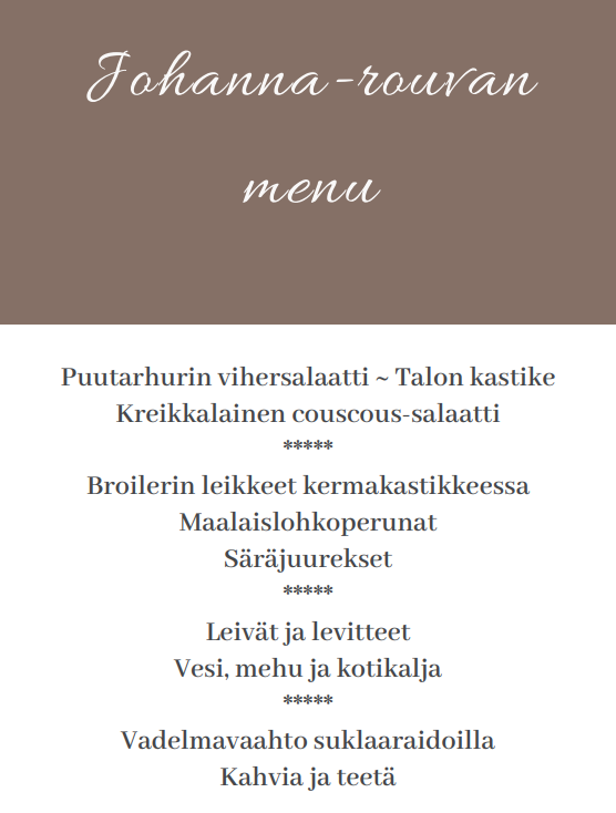 Köökistä olemme valinneet illalliselle entisaikoja henkivän Johanna-rouvan menun (48 €), joka katetaan meille privaatisti. Langin Kauppahuoneella on anniskeluoikeudet ja illallisen seuraksi voit valita menuun sisältyven ruokajuomien lisäksi fiinimpääkin kyytipoikaa.