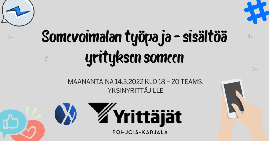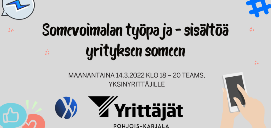 Työpajan tarjoaa Pohjois-Karjalan Yrittäjät ry ja Somevoimala, Tapahtuma on maksuton ja kaikille avoin. Lisätiedot joonas.hiltunen@yrittajat.fi, p. 050 448 8468. Lämpimästi tervetuloa!