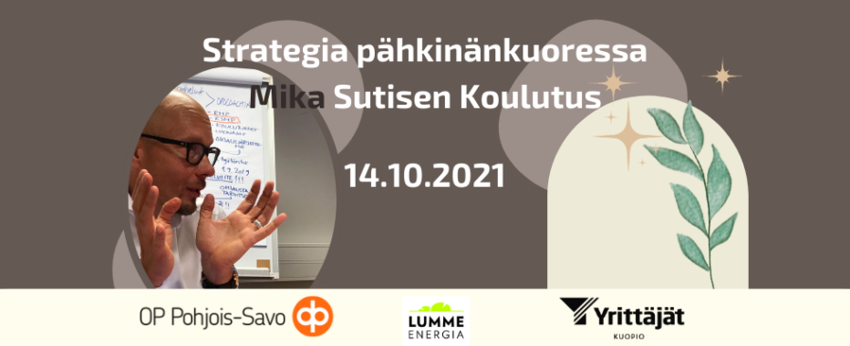 Tervetuloa mukaan Mika Sutisen vetämään aktiiviseen strategiailtapäivään 14.10. klo 9.30-15.00. Tapahtumaan voit osallistua joko livenä tai etänä.