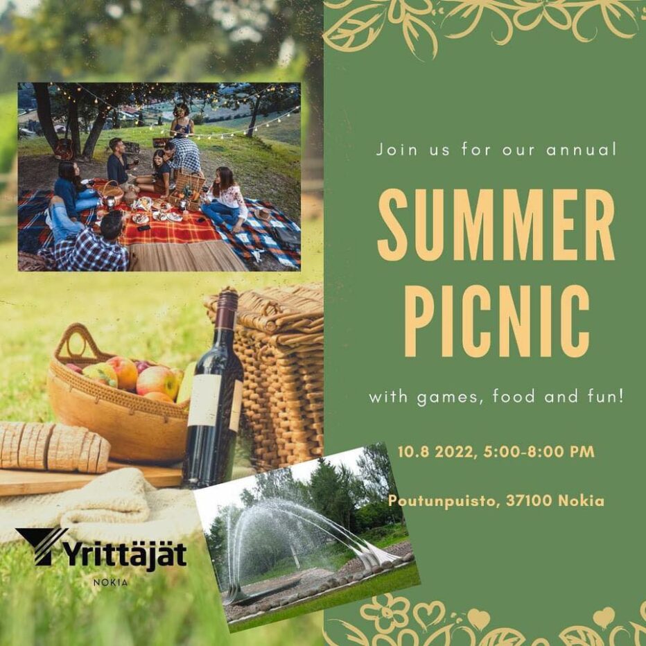 Tapaamme vapaamuotoisesti piknikin merkeissä Poutunpuistossa. Voit ottaa omia eväitä, tulla tarjoamaan bravuuriruokaasi tai -leivonnaisia, maistelemaan muiden herkkuja ja nauttimaan iloisesta seurasta! Tule rohkeasti paikalle – tutustutaan toisiimme! Luvassa hauskaa yllätysohjelmaa!