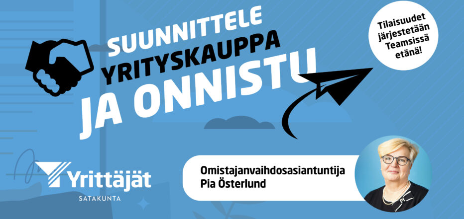 - Tule kuulemaan lisää Suunnittele yrityskauppa- ja onnistu- aamuinfoon Teamsissä tunnin tietoiskuna seuraavasta aiheesta: