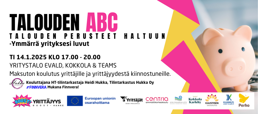 Haluatko ymmärtää paremmin yrityksesi talouden lukuja? Tule mukaan maksuttomaan koulutukseen, jossa käydään selkeästi ja käytännönläheisesti läpi tilinpäätöksen lukeminen, taloudenhallinta ja kannattavuuden parantaminen. Voit ottaa mukaan oman tilinpäätöksesi! Lisäksi Finnvera kertoo, mitä rahoittaja katsoo yrityksen talousluvuista.