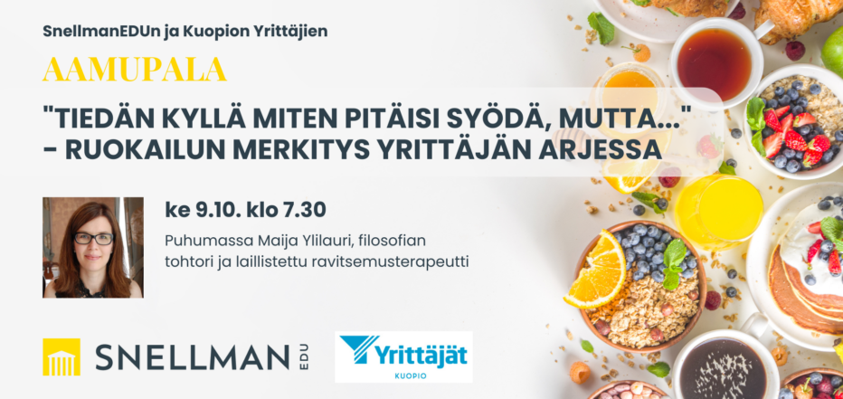 Puhumassa Maija Ylilauri, filosofian tohtori ja laillistettu ravitsemusterapeutti. Lisäksi Maija on juuri aloittanut koulutussuunnittelijana SnellmanEDUlla.