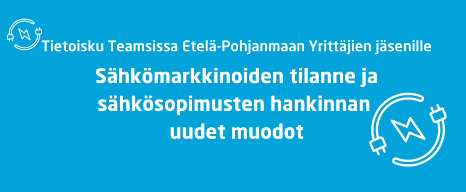 Etelä-Pohjanmaan Yrittäjien jäsen! Tervetuloa ajankohtaiseen tietoiskuun sähkömarkkinoiden tilanteesta ja sähkösopimusten hankinnan uusista muodoista.