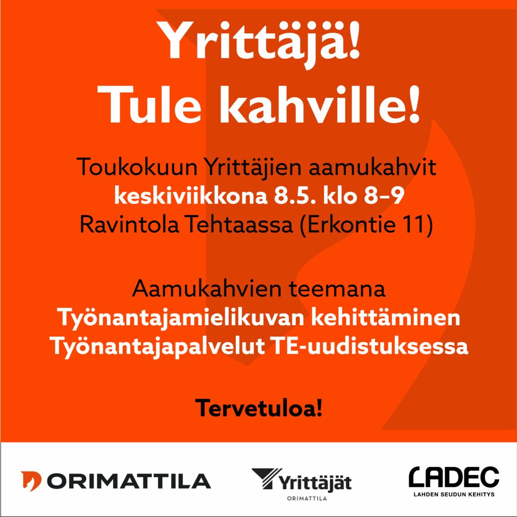 Orimattilan kaupungin, Orimattilan Yrittäjien ja Lahden Seudun Kehitys LADEC Oy:n järjestämät Yrittäjien aamukahvit järjestetään seuraavan kerran keskiviikkona 8.5. klo 8. Paikka on Ravintola Tehdas (os. Erkontie 11).