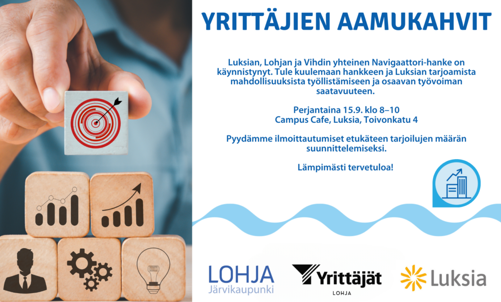 Luksian, Lohjan ja Vihdin yhteinen Navigaattori-hanke on käynnistynyt. Tule kuulemaan hankkeen ja Luksian tarjoamista mahdollisuuksista työllistämiseen ja osaavan työvoiman saatavuuteen. Paikalla mm. Luksian rehtori Markku Loiskekoski ja Navigaattorin toimijoita.