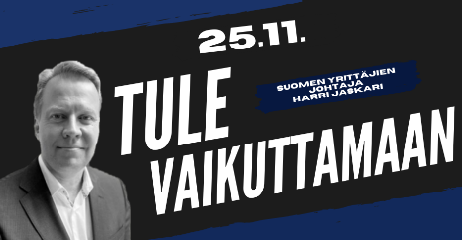 Tule kuulemaan ja keskustelemaan Suomen Yrittäjien elinkeinopoliittisesta vaikutustyöstä siitä vastaavan johtaja Harri Jaskarin kanssa 25.11. klo 14–16. Tapahtuma järjestetään Ofision tiloissa, Snellmaninkatu 2.