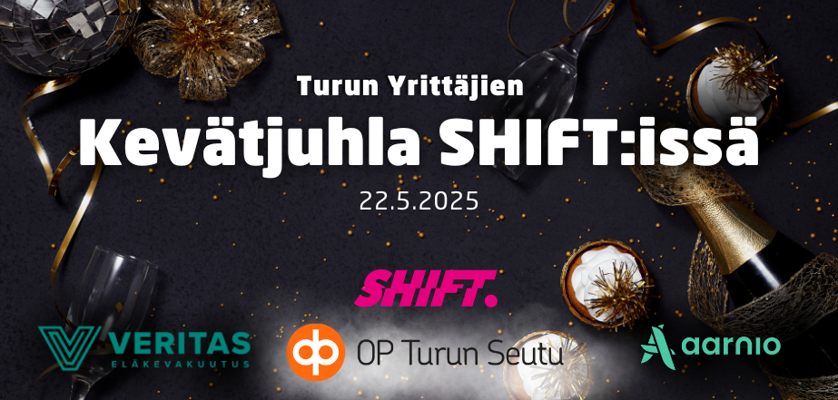Turun Yrittäjien kevätjuhla järjestetään tänä vuonna SHIFT:in yhteydessä! Palkitsemistilaisuuteen ja Loungeen on pääsy kevätjuhlan lipun hankkineille. Tapahtuman mahdollistaa OP Turun Seutu, Veritas Eläkevakuutus ja Tilitoimisto Aarnio.