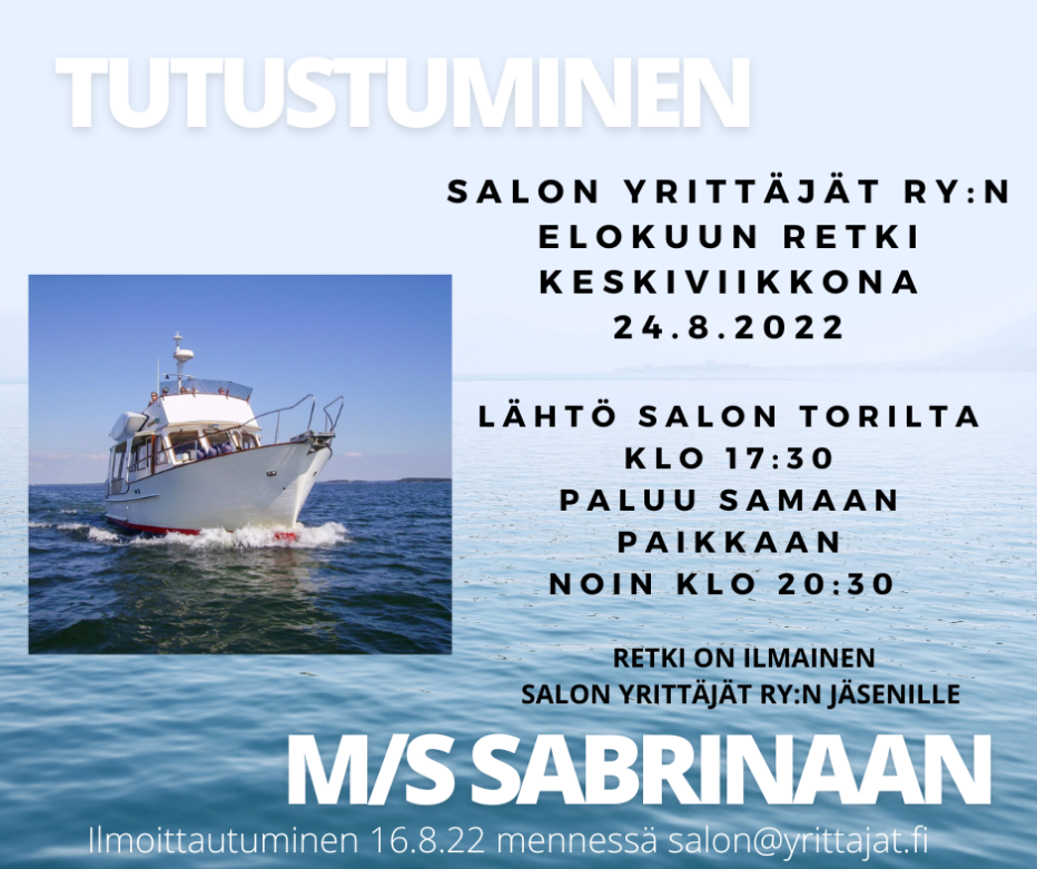 Matkaamme Särkisaloon Salon Tilausmatkat Oy:n linja-autolla, tutustumme M/S Sabrina veneeseen sekä nautimme pientä purtavaa veneellä / rannassa. Palaamme linja-autolla Salon torille noin klo 20:30 aikoihin.
