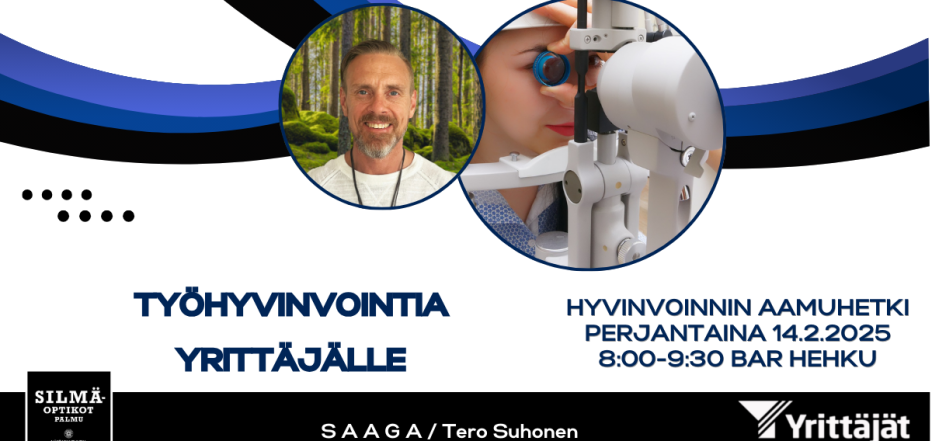 Järjestämme aamukahvitilaisuuden, jossa kuulet työhyvinvoinnista kahdesta eri näkökulmasta, tule mukaan.Kuulemme mielenkiintoiset ja hyödylliset puheenvuorot asiantuntijoilta:* Työfysioterapeutti ja hyvinvointivalmentaja Tero Suhonen* Optometristit Elina Paturi ja Pekka PalmuAamun aiheina työhyvinvointi laajasti:* Elina ja Pekka tulevat puhumaan erityistyölaseista ja työsuojalaseista. Nämä molemmat ovat työnantajan korvausvelvollisuuden piiriin kuuluvat, työntekijälle työtä varten tehdyt silmälasit.He kertovat, mitä tällaiseen prosessiin kuuluu, milloin työnantaja on velvollinen hankkimaan työntekijälle erityistyölasit tai työsuojalasit ja mitä hyötyjä laseista saadaan.Yrittäjän on huolehdittava myös omasta näkökyvystään, työssä ja vapaa-ajalla. Nyt on hyvä tilaisuus kuulla asiaa ja esittää kysymyksiä Elinalle ja Pekalle.