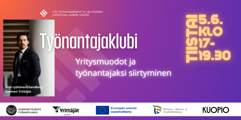 Liity Työnantajaklubiin ja vie yrityksesi johtaminen uudelle tasolle! Työnantajaklubi tarjoaa neljä erilaista teemaa, jotka auttavat sinua kehittämään työyhteisösi kulttuuria ja johtamistaitoja. Teemat kattavat mm. työnantajamielikuvan rakentamista, esihenkilön mindsetin ja työnantajaidentiteetin kasvattamisesta, sekä yritysmuodoista ja verotuksesta. Lisäksi pääset kuulemaan asiantuntijoiden puheenvuoroja ja osallistumaan sparrauksiin muiden esihenkilöasemassa toimivien kanssa. Työnantajaklubissa voit jakaa kokemuksia, oppia uutta ja saada tukea roolimuutokseesi yksinyrittäjästä esimieheksi. Tervetuloa mukaan kehittämään itseäsi ja organisaatiotasi!