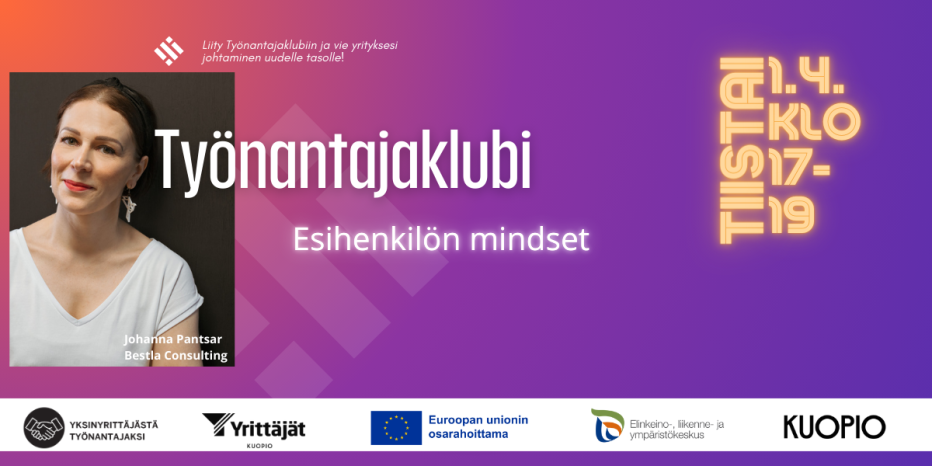 Työnantajaklubin ensimmäisessä osassa pureudutaan esihenkilön mindsetiin Johanna Pantsarin, Bestla Consulting johdolla. Johanna avaa työnantajaksi siirtymisen vaiheita sekä johtajuuden mindsetiä vahvan kokemuksensa johtamisen ja organisaation kehittämisen kautta. Asiantuntijapuheenvuoron lisäksi luvassa on käytännön esimerkkejä ja vuorovaikutteinen keskusteluosuus, jossa osallistujat voivat jakaa kokemuksia ja parhaita käytäntöjä. Työnantajaklubi on loistava paikka sparrailuun ja verkostoitumiseen muiden yrittäjien kanssa.