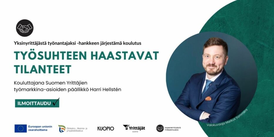 Lämpimästi tervetuloa tiistaina 12.11.2024 klo 16.30 Yksinyrittäjästä työnantajaksi -hankkeen järjestämään Työsuhteen haastavat tilanteet -koulutukseen.