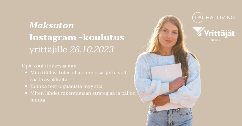 INSTAGRAM -koulutuksen to 26.10. klo 18-19 Teamsissa!Kouluttajana toimii ammattitaitoinen Lauha Living -yrityksen perustaja ja sometaituri Anniina Hurme @lauhaliving.Koulutuksessa opit mm.• Mitä instagram -tililläsi tulee olla kunnossa, jotta saat asiakkaita• Kuinka teet orgaanista myyntiä• Miten lähdet rakentamaan strategiaa ja paljon muuta!Lähetämme osallistuneille linkin sinulle sähköpostiin kyseisenä päivänä.
