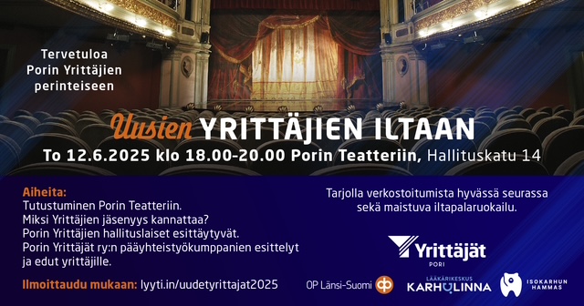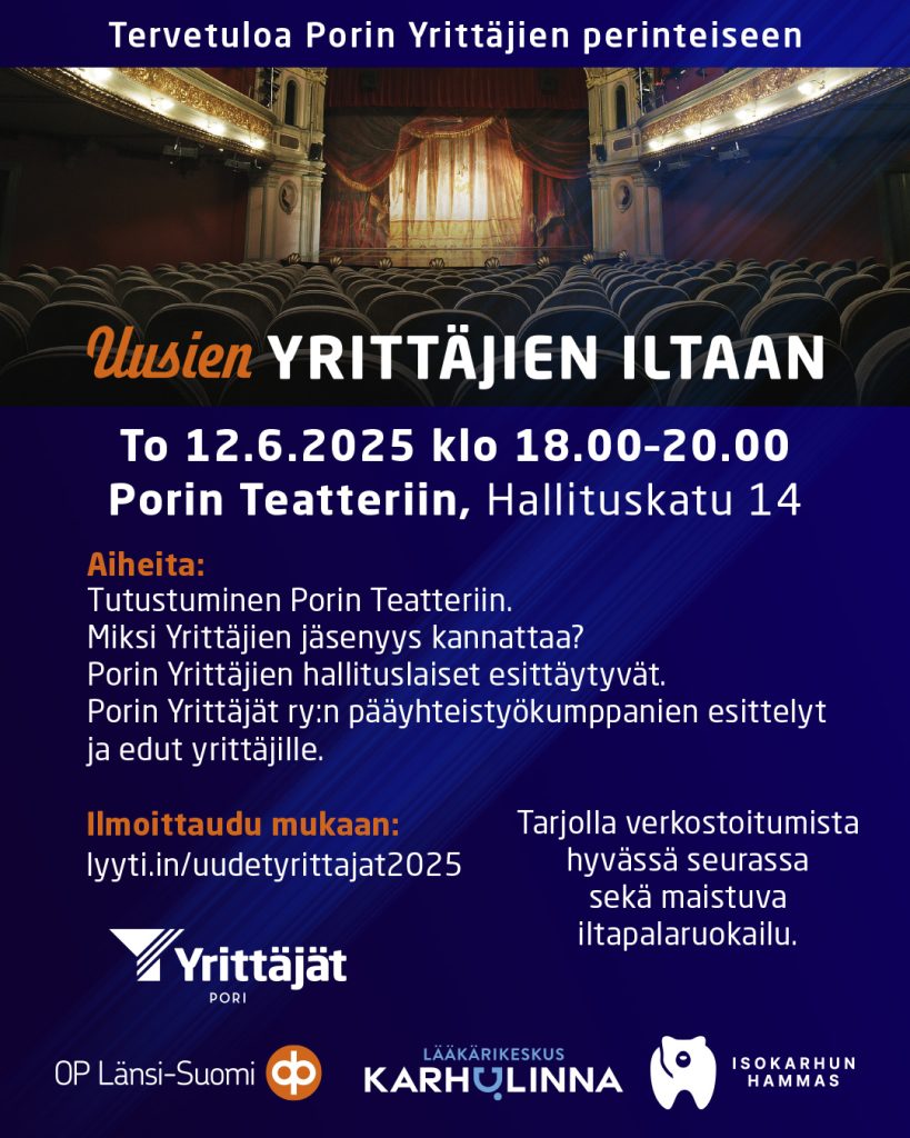 Tapahtuma Uusien yrittäjien ilta 12.6.2025 klo 18:00 – 20:00 Pori Porin Yrittäjät Ilmoittaudu tästä mukaan { "name":"Uusien yrittäjien ilta", "description":"Linkki ilmoittautumiseen:\n[url]https://www.lyyti.fi/reg/uudetyrittajat2025[/url]", "startDate":"2025-06-12", "startTime":"18:00", "endDate":"2025-06-12", "endTime":"20:00", "location":"Porin teatteri", "label":"Lisää kalenteriin", "options":[ "Apple", "Google", "iCal", "Microsoft365", "MicrosoftTeams", "Outlook.com", "Yahoo" ], "inline":true, "listStyle":"modal", "trigger":"click", "timeZone":"Europe/Helsinki", "iCalFileName":"Yrittajat.fi - Uusien yrittäjien ilta" } Maksuton jäsenille Porin teatteri, Pori Uudet jäsenet Jaa Kopioitu leikepöydälle
