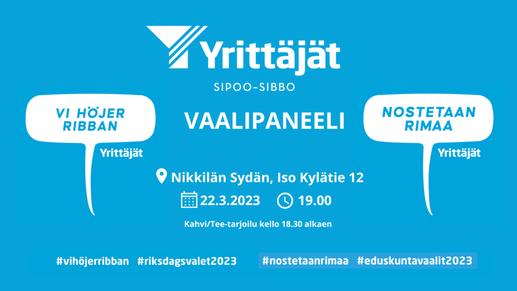 Eduskuntavaalit pidetään 2.4.2023 ja Sipoon Yrittäjät – Sibbo Företagare järjestävät vaalipaneelin sipoolaisille ehdokkaille keskiviikkona 22.3 kello 19.00 ja ovet avataan yleisölle kello 18.30 alkaen. Vaalipanelisteiksi ollaan kutsuttu yksi ehdokas jokaisesta puolueesta jossa on sipoolainen eduskuntavaaliehdokas. Nyt on loistava hetki esittää kysymyksiä paikallisille ehdokkaille teille tärkeistä aiheista. Tilaisuutta on mahdollista seurata myös etänä striimin kautta.