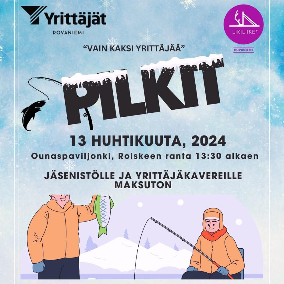 Tervetuloa mukaan jännittävän viihdyttävään ”VAIN KAKSI YRITTÄJÄÄ” -pilkkitapahtumaan lauantaina 13.4. Ounaspaviljongille. Tämä ainutlaatuinen tapahtuma tarjoaa loistavan tilaisuuden viettää aikaa yrittäjäkollegoiden kanssa, nauttia Lapin upeasta luonnosta sekä Roiskeen talviaktiviteeteistä ja testata kalastustaitoja leikkimielisessä pilkkikilpailussa.Tapahtuman ohjelma:13:30 Kilpailukanslia avautuu15:00 Pilkkikilpailu alkaa18:00 Pilkkikilpailu päättyy18:20 Palkintojen jako sekä arpajaiset18:45 Ruokailua, juomien kilistelyä ja illanviettoa Roiskeella.Roiskeen sähkösaunat ja avantouinti ovat avoinna 13:30 alkaen. Roiskeen puulämmitteinen ulkosauna on avoinna klo 18:00 alkaen. DJ Paksupaulus soittaa 15:00 alkaen.Osallistuminen on maksutonta kaikille Rovaniemen Yrittäjien ja Likiliike Rovaniemen jäsenille. Haastamme yrittäjät ottamaan mukaan yhden yrittäjäkaverin, joka ei vielä kuulu jompaan kumpaan järjestävistä yrittäjäjärjestöistä.