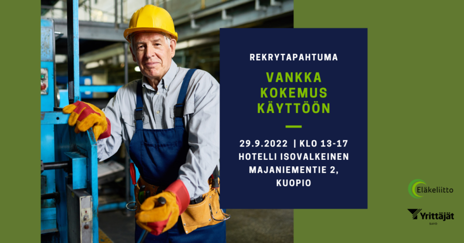 Eläkeliiton Eläkkeeltä töihin -hanke, Savon Yrittäjät ja Eläkeliiton Pohjois-Savon piiri järjestävät Vankka kokemus käyttöön -rekrytapahtuman, jossa saatetaan yhteen työntekijöitä tarvitsevat yrittäjät/työnantajat ja ansiotyöhön haluavat ja osaamistaan tarjoavat eläkeläiset.