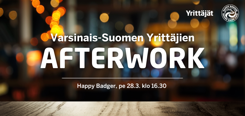Tervetuloa Varsinais-Suomen Yrittäjien afterwork-tilaisuuteen perjantaina 28.3. klo 16.30 alkaen. Tapahtuma järjestetään jäsenyrityksessämme Happy Badger Board Game Caféssa Hansakorttelissa (Naantalin Aurinkoisen entiset tilat).