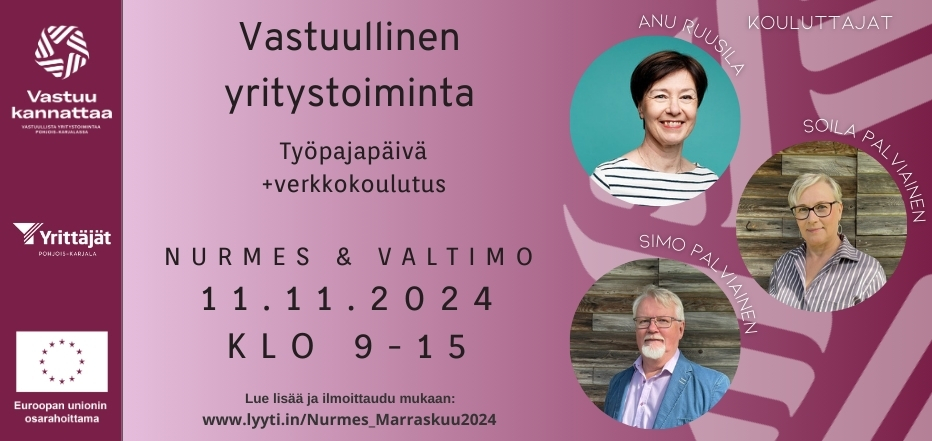 Tule mukaan ilmaiseen työpajapäiväämme Nurmekseen oppimaan yritysvastuusta ja vastuullisesta yritystoiminnasta kokeneiden kouluttajiemme johdolla!