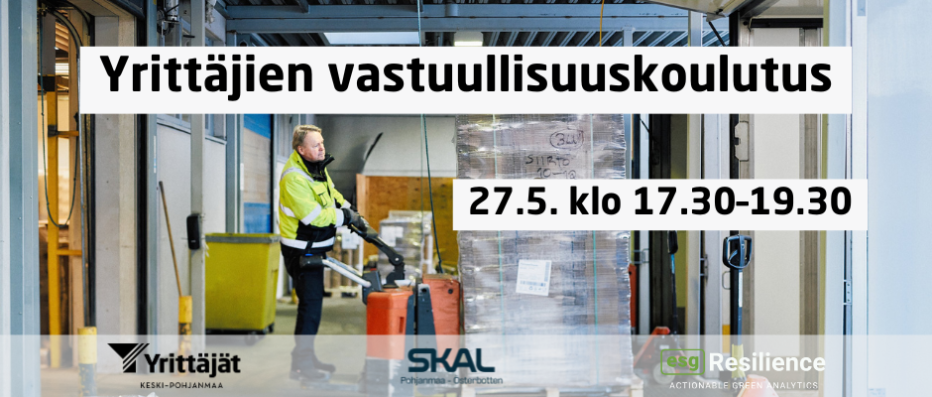 Yritysten vastuullisuuteen kiinnitetään entistä enemmän huomiota, ja se on yhä tärkeämpi osa yritysten arkea. Tervetuloa SKAL Pohjanmaa-Österbottenin ja Keski-Pohjanmaan Yrittäjien järjestämään vastuullisuuskoulutukseen, jossa käsitellään vastuullisuuden perusasioiden lisäksi pk-yritysten päästölaskentaa ja kestävyysraportointia.