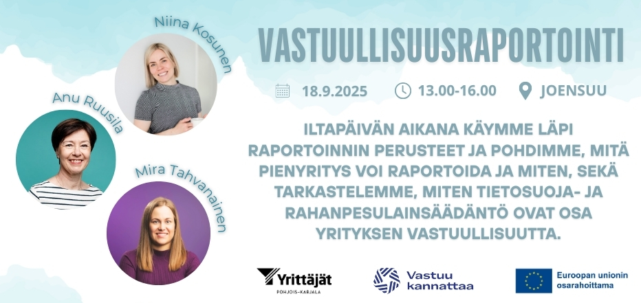 Käymme läpi raportoinnin perusteet ja pohdimme, mitä pienyritys voi raportoida ja miten, sekä tarkastelemme, miten tietosuoja- ja rahanpesulainsäädäntö ovat osa yrityksen vastuullisuutta.