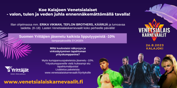 Suomen Yrittäjien jäsenille kaikista lipputyypeistä -10%, kampanjakoodilla SYJASEN