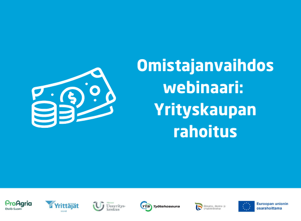Tervetuloa omistajanvaihdoswebinaariin, joka käsittele Yrityskaupan rahoitusta. Webinaarissa asiantuntijoina kuulemme yrityksiä rahoittavan Finnveran asiantuntija Marjo Seppälää sekä pankin yritysasiantuntijaa.