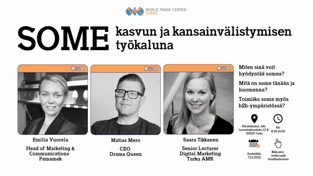 Miten sinä voit hyödyntää somea kasvussa ja kansainvälistymisessä? Miltä näyttää digitaalinen markkinointi ja some tänään ja huomenna? Toimiiko some myös b2b-ympäristössä kasvun ja kansainvälistymisen työkaluna?