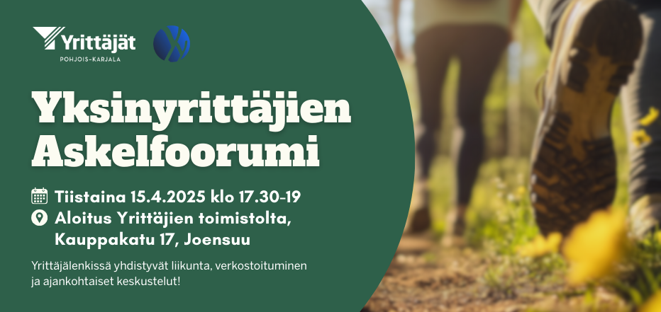 Nappaa mukaasi lenkkarit ja sään mukainen varustus. Ilmoittaudu mukaan viimeistään to 10.4. Lisätiedot ja ilmoittautumiseen liittyvät asiat Joonas Hiltuselta, sähköpostitse joonas.hiltunen@yrittajat.fi tai puh 050 448 8468. Tapahtuman järjestää Pohjois-Karjalan Yrittäjien yksinyrittäjien verkosto YY-sakki ja se on suunnattu yksinyrittäjille.