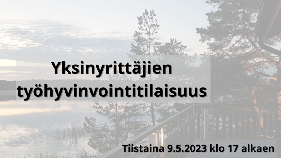 Yksinyrittäjä, nyt sinulla on mahdollisuus osallistua hyvässä seurassa työhyvinvointitilaisuuteen Hyvinvointi- ja elämyskeskus Helmirannassa tiistaina 9.5.2023 klo 17:00 alkaen.