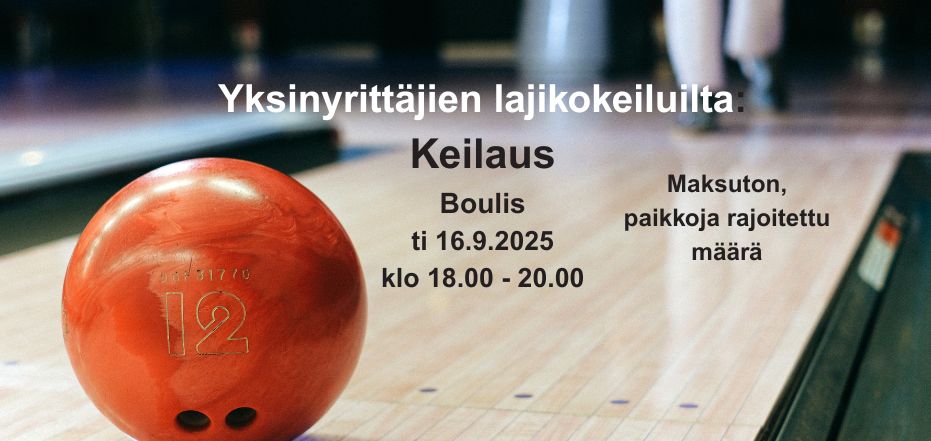 Yksinyrittäjien verkosto käynnistää lajikokeilu -harrasteryhmän ja ensimmäisenä lähdemme tutustumaan keilaamiseen Boulikseen Kempeleeseen. Yrittäjä Riku Laine kertoo alkuun oman yrittäjätarinansa ja sen jälkeen pääsemme kokeilemaan keilaamista. Tämä on erinomainen mahdollisuus myös vasta-alkajille!