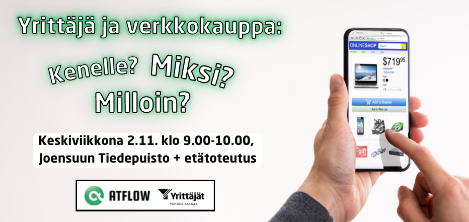 Tule kuulemaan koulutukseen kuulemaan joensuulaisen digitoimisto atFlow Oy:n toimitusjohtaja Pekka Rönkkösen vinkit verkkokaupan perusteisiin, alkuun laittamiseen, kehittämiseen ja jatkojalostamiseen. Luvassa myös muita vinkkejä ja neuvoja aiheesta. Nyt sinulla on erinomainen tilaisuus laajentaa tietouttasi, vaikka asia ei olisikaan vielä ajankohtainen!