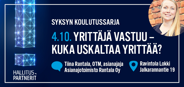 Lahden Yrittäjien syksyn koulutussarjan ensimmäisessä osassa asianajaja Tiina Rantala kertoo yrittäjän vastuusta.