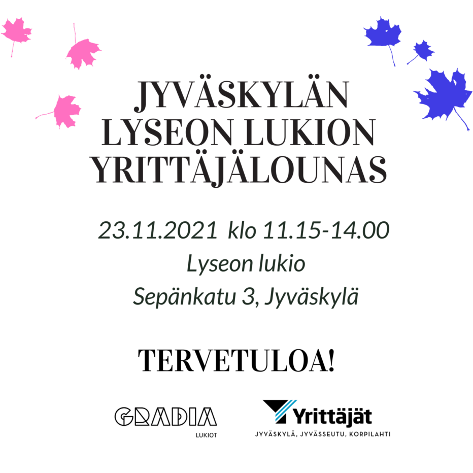 Tervetuloa mukaan yrittäjälounaalle tiistaina 23.11. klo 11.15-14.00 Lyseon lukiolle!