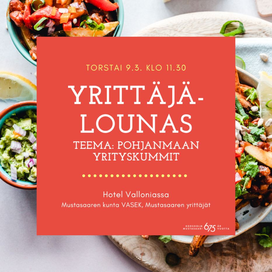 Maaliskuun toisena torstaina pääset verkostoitumaan ja tapaamaan muita yrittäjiä lounaalla. Lounaalle osallistuvat myös Mustasaaren kunnan elinkeinopäällikkö ja elinkeinokoordinaattori, Mustasaaren Yrittäjien edustaja sekä VASEKin yritysneuvoja. Mustasaaren kunta tarjoaa lounaan kaikille ilmoittautuneille yrittäjille. Teemana on Pohjanmaan yrityskummit