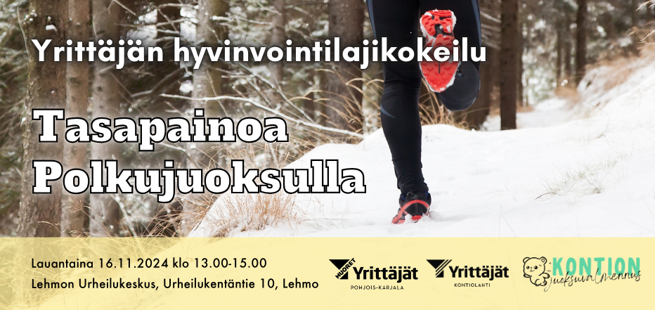 Pohjois-Karjalan Nuoret Yrittäjät kutsuvat sinut mukaan Yrittäjien hyvinvointia edistävään polkujuoksutapahtumaan! Tapahtuma tarjoaa osallistujille mahdollisuuden tutustua polkujuoksuun ammattivalmentajan johdolla, verkostoitua muiden yrittäjien kanssa sekä kuulla inspiroivan yritystarinan.