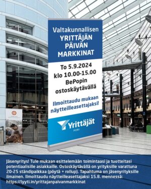 Porin Yrittäjät järjestää valtakunnallisen Yrittäjän päivän kunniaksi 5.9.2024 asiantuntijakeskus BePopin ostoskäytävällä klo 10–15 Yrittäjän päivän -markkinat Jäsenyrityksillämme on mahdollista esitellä toimintaansa ja tuotteita potentiaalisille asiakkaille. Ostoskäytävällä on yrityksille varattuna 20–25 ständipaikkaa (pöytä + rollup). Tapahtuma on jäsenyrityksille ilmainen.